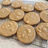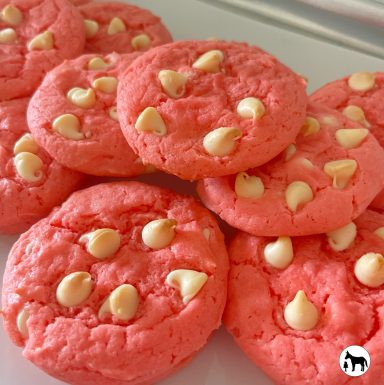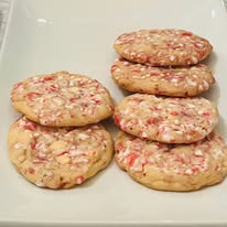 A soft crumbly cookie with a light flavor of peppermint and filled with white chocolate chunks and crushed peppermint candy