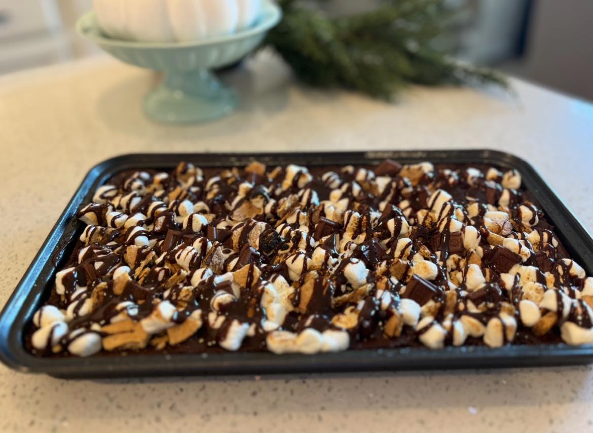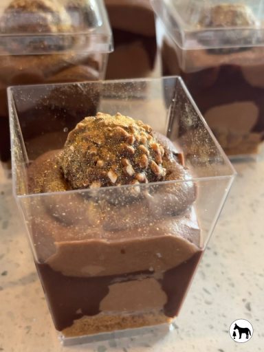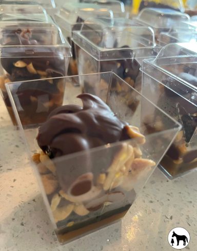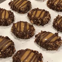 A delicious chocolate cookie coated in chopped pecans with a pool of rich dulce de leche and a drizzle of chocolate